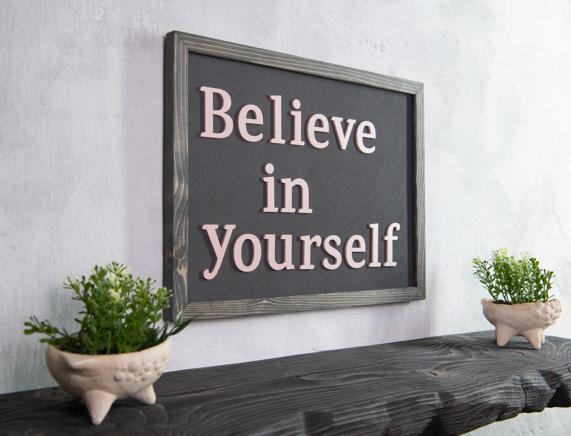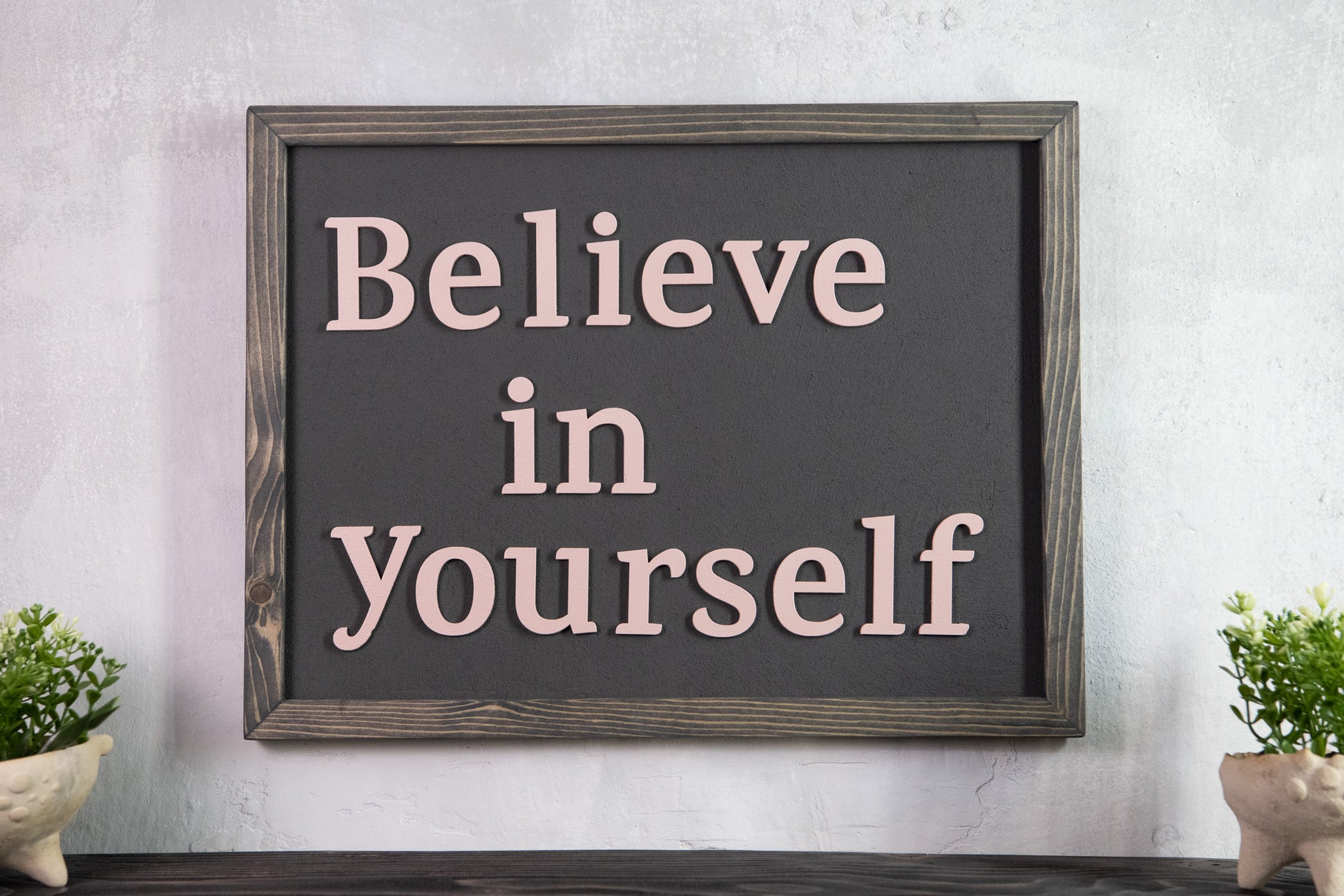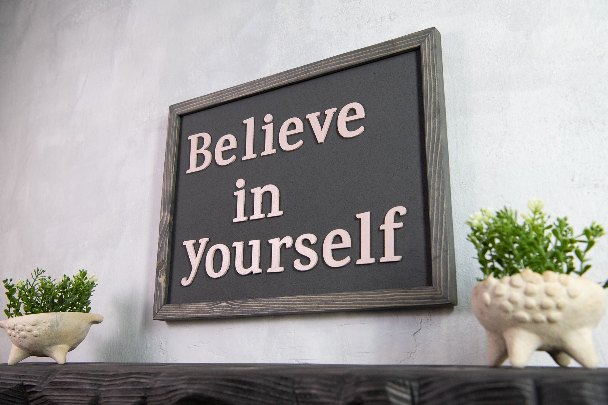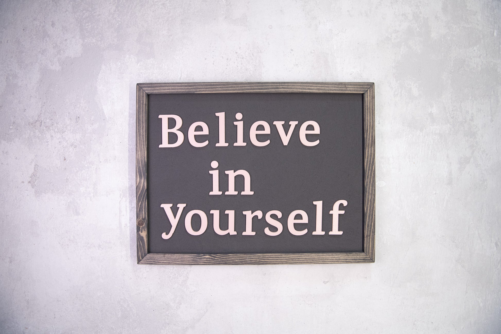Ξύλινη Πινακίδα Τοίχου – Believe in Yourself – Χειροποίητη με Εφέ Τσιμέντου