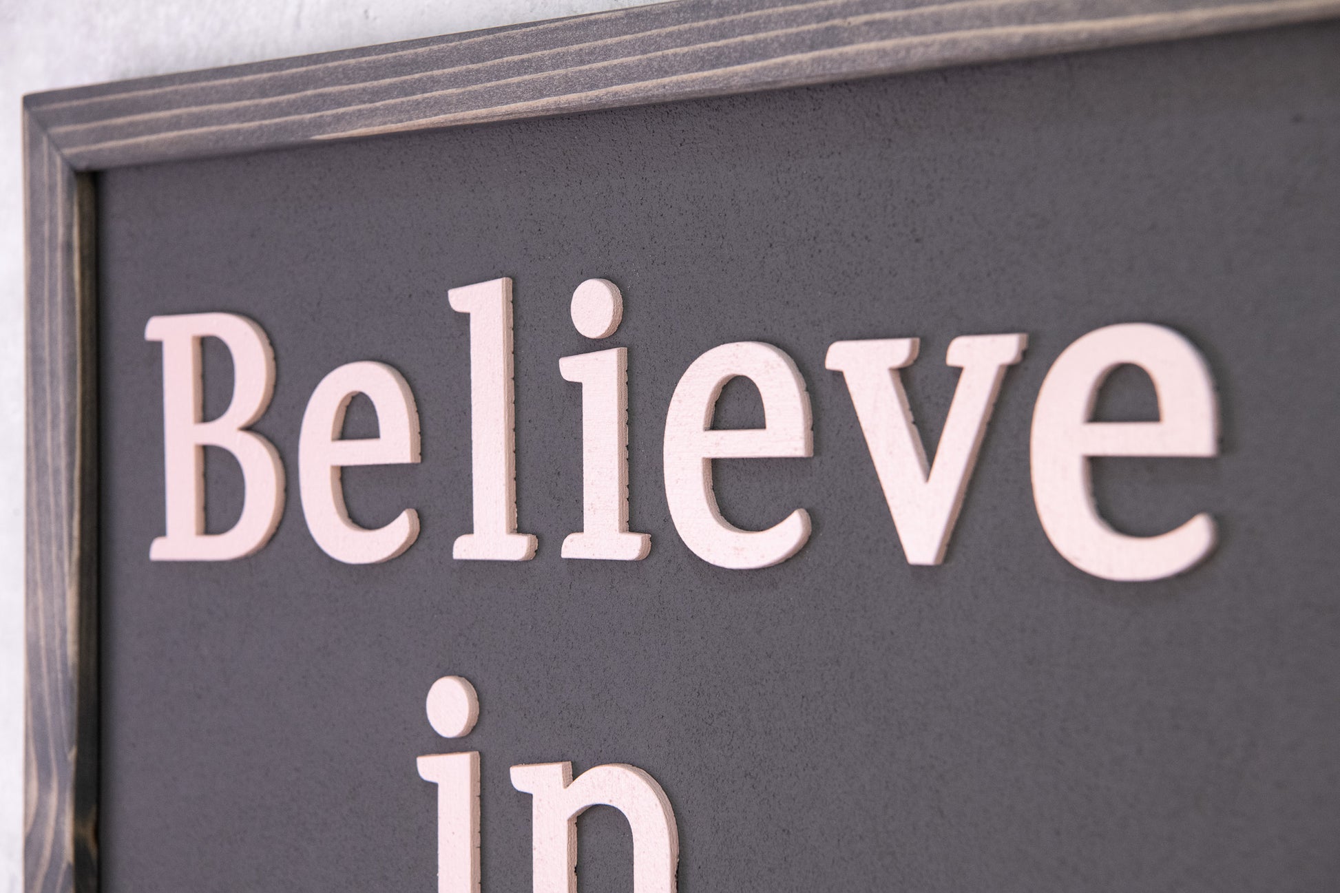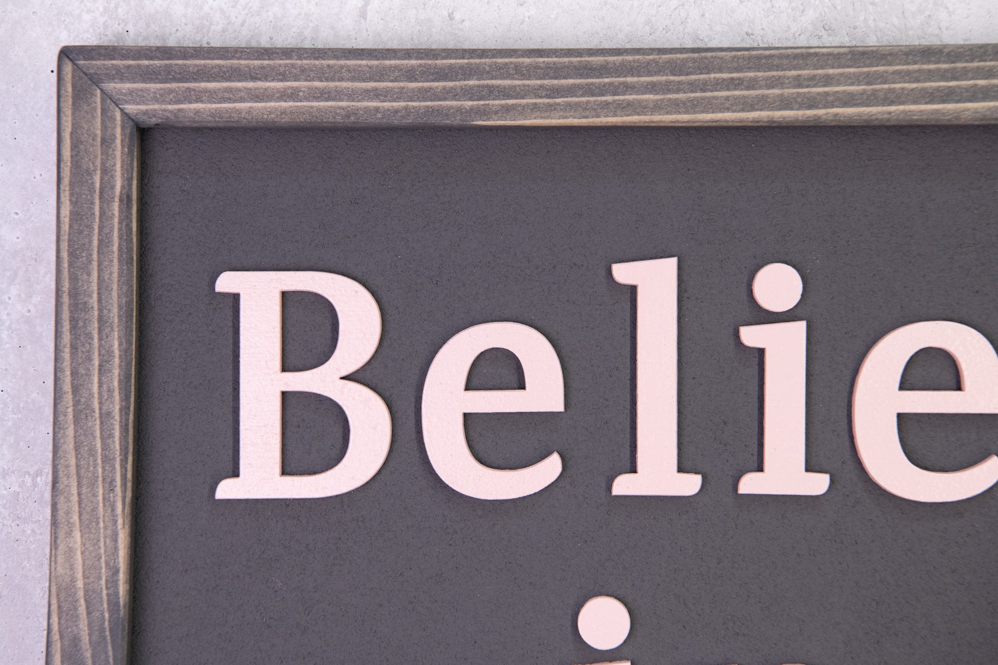 Υλικά: Φτιαγμένη με κορνίζα από πεύκο, πλάτη MDF με υφή και εφέ τσιμέντου σε ματ ανθρακί, και ανάγλυφα γράμματα από κόντρα πλακέ σε απαλό ροζ (blush pink). Κάθε λεπτομέρεια είναι σχεδιασμένη για να αντικατοπτρίζει αντοχή και κομψότητα – όπως ακριβώς και το μήνυμα που κουβαλά.