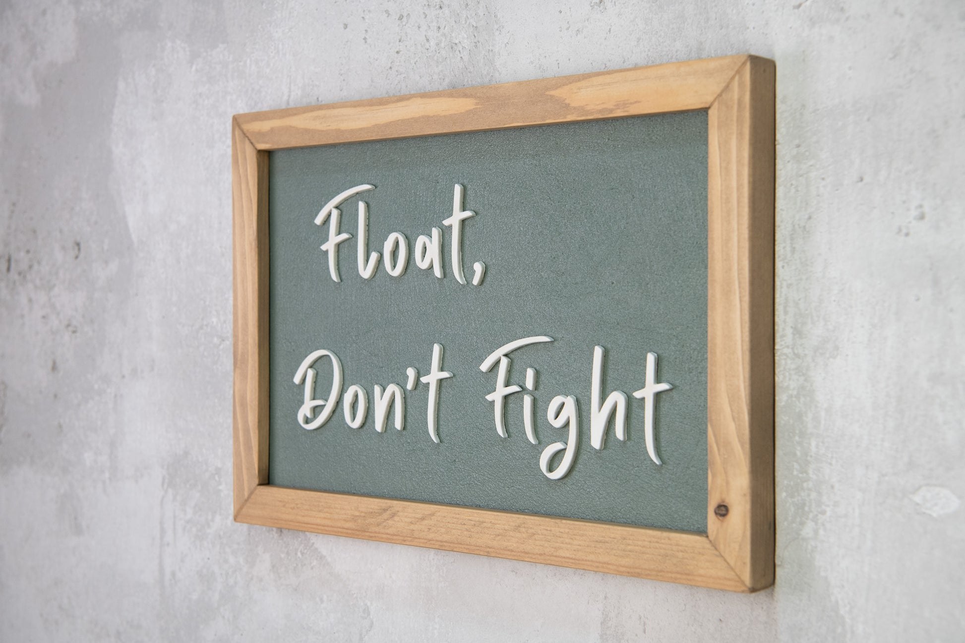 Float, Don’t Fight – χειροποίητη ξύλινη πινακίδα με εφέ τσιμέντου