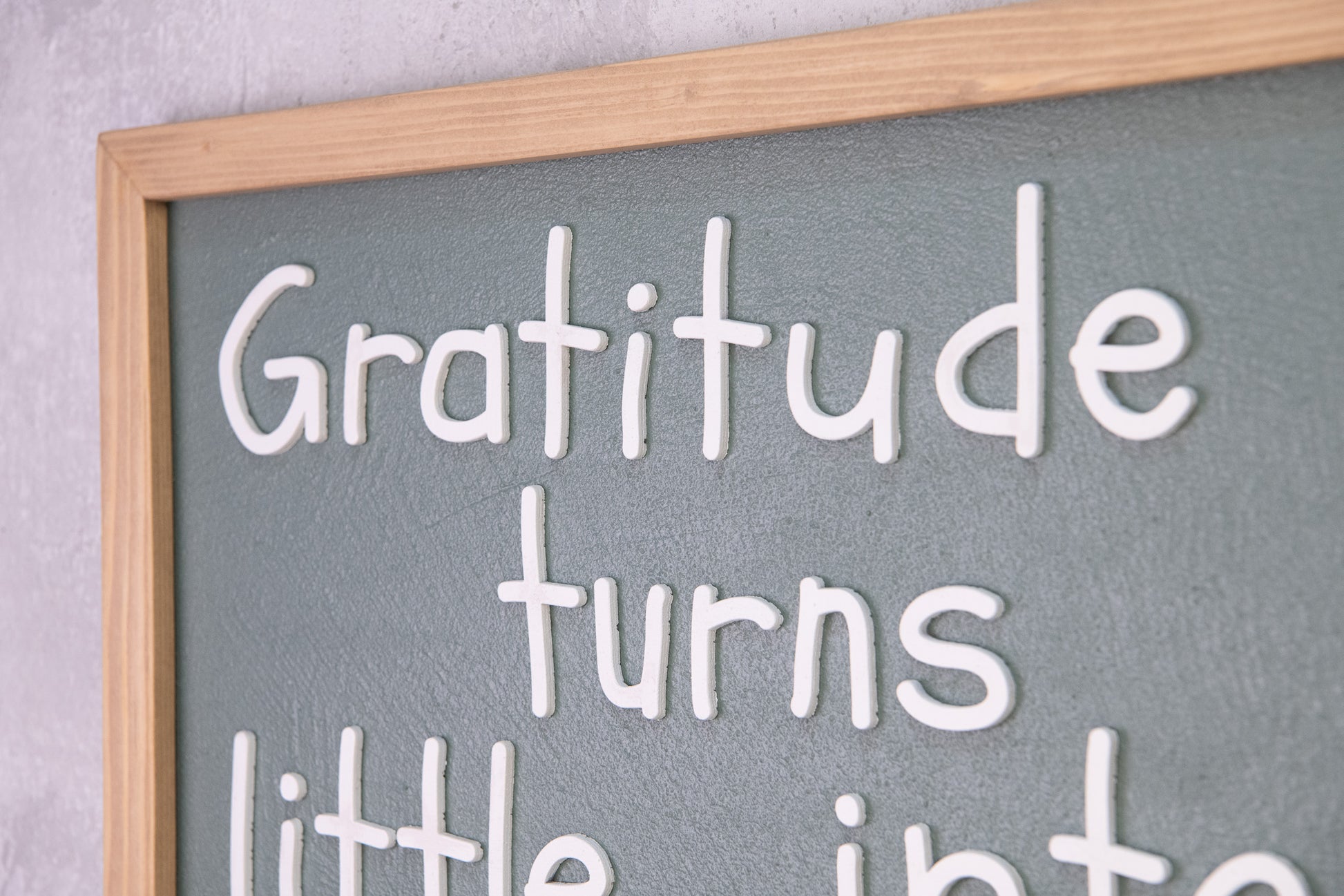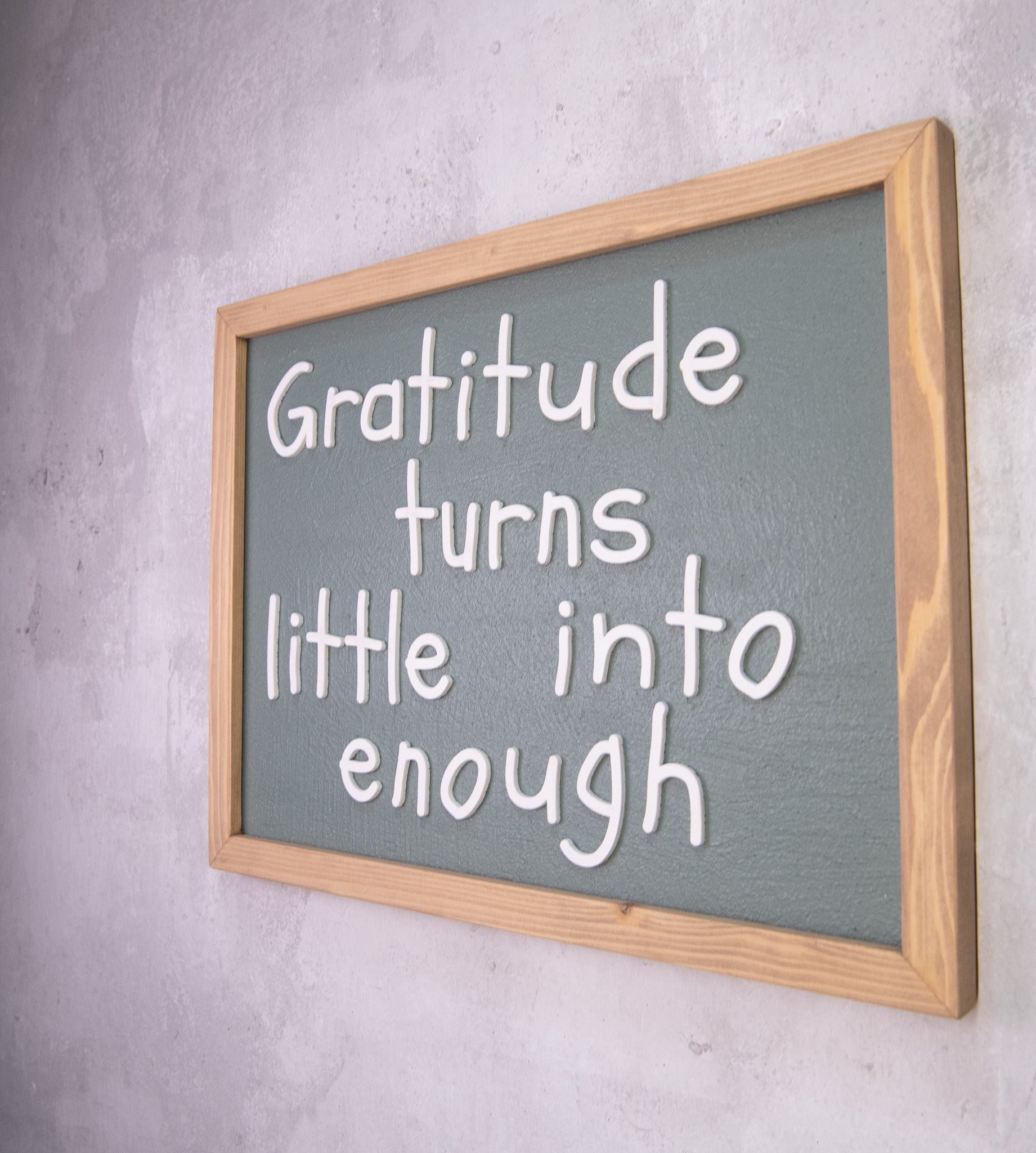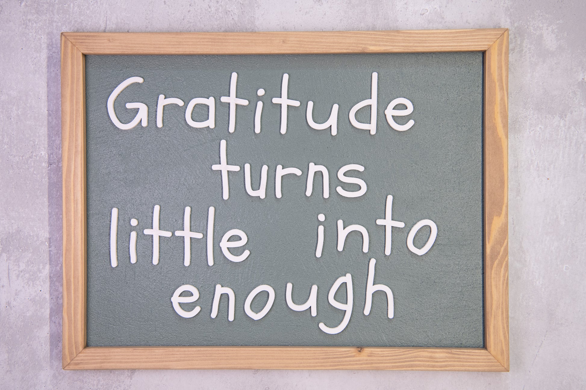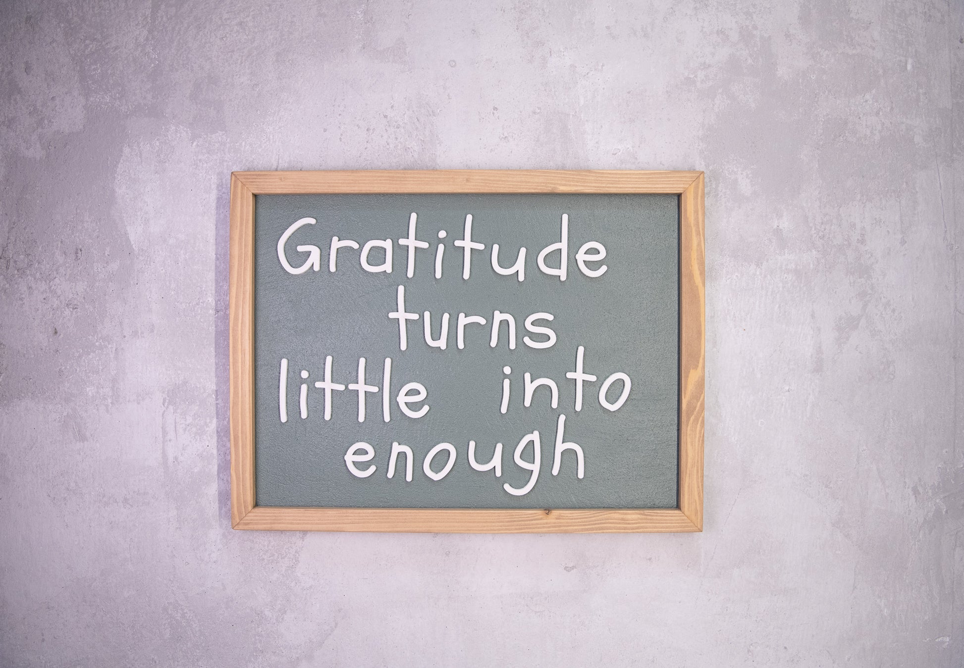 Ξύλινη Πινακίδα Τοίχου – Gratitude Turns Little into Enough – Χειροποίητη με Εφέ Τσιμέντου