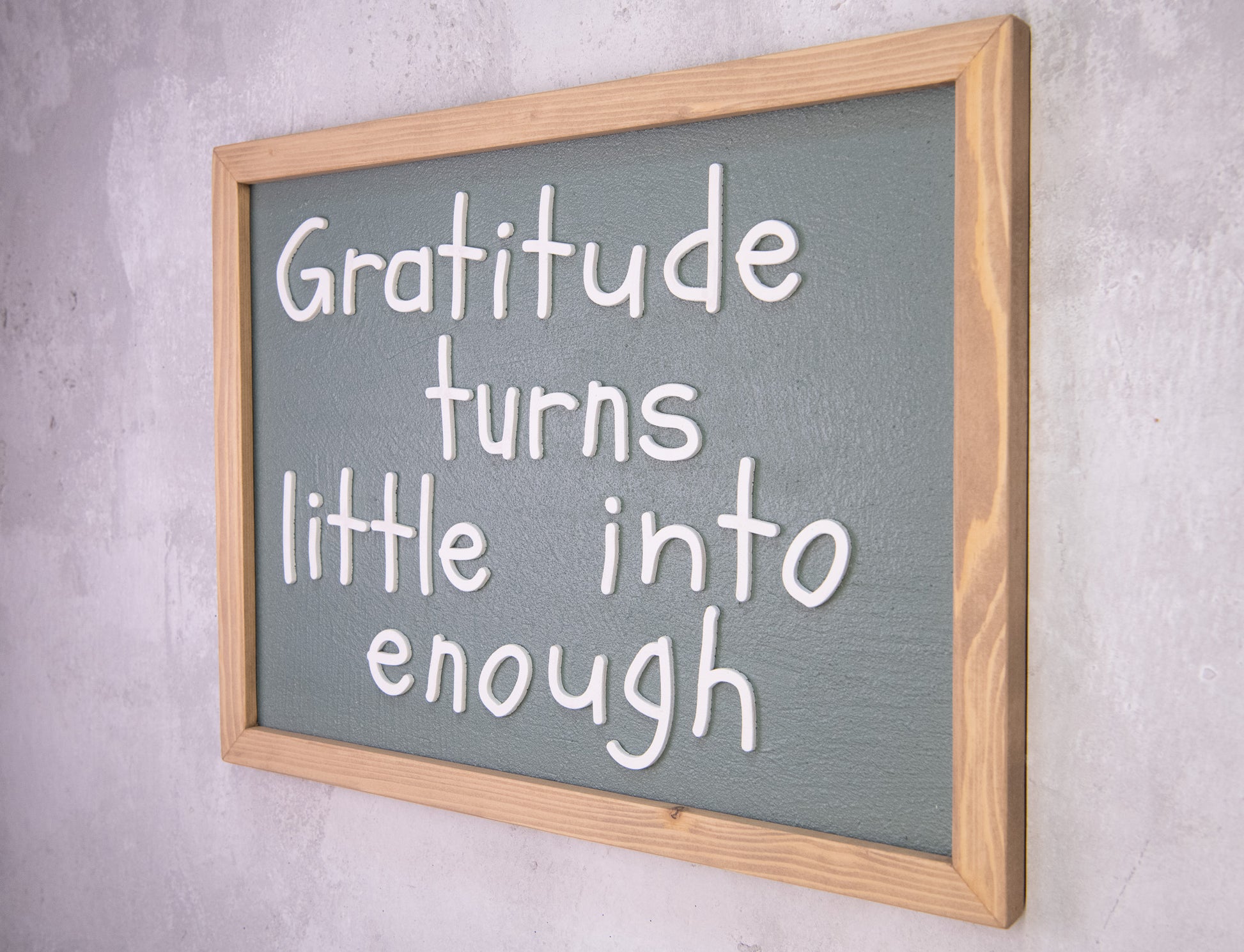 Η ευγνωμοσύνη έχει τη δύναμη να μεταμορφώσει τα πάντα. Το μήνυμα “Gratitude turns little into enough” είναι μια υπενθύμιση ότι η χαρά δεν έρχεται από όσα μας λείπουν, αλλά από την εκτίμηση σε όσα ήδη έχουμε. Αυτή η χειροποίητη ξύλινη πινακίδα τοίχου σε προσκαλεί να καλλιεργήσεις ευγνωμοσύνη και να αγκαλιάσεις τον πλούτο της απλότητας στην καθημερινότητα.