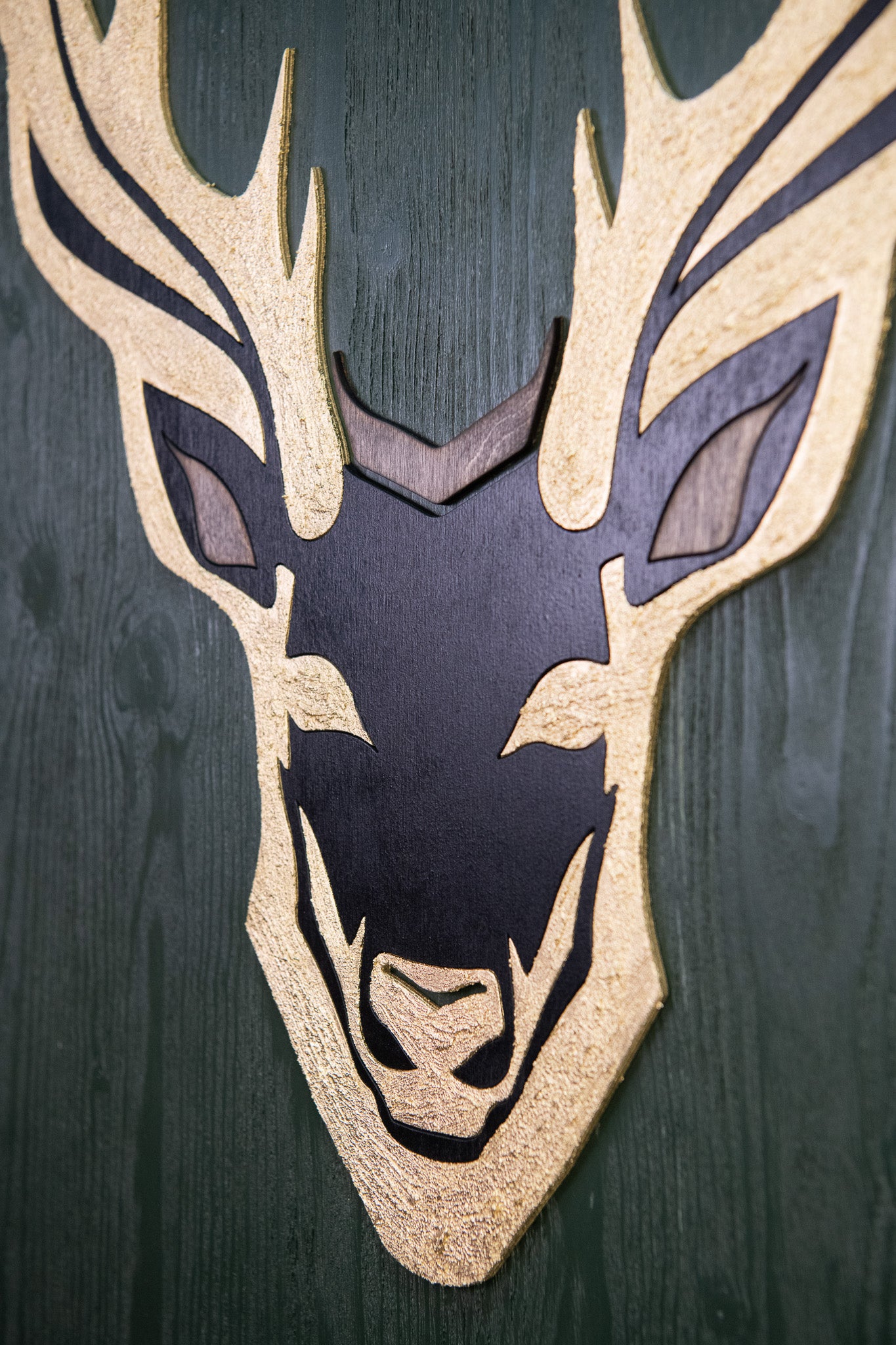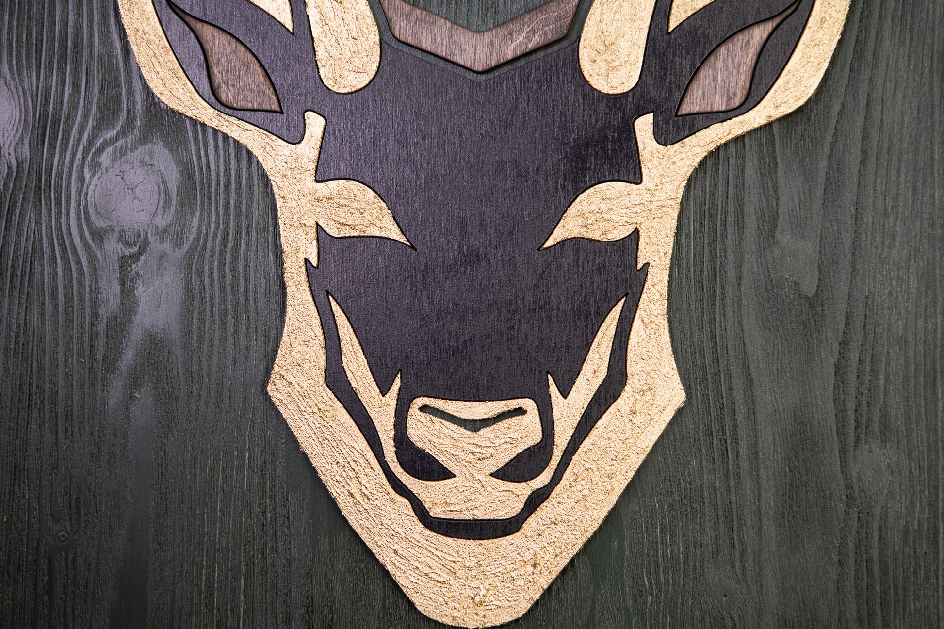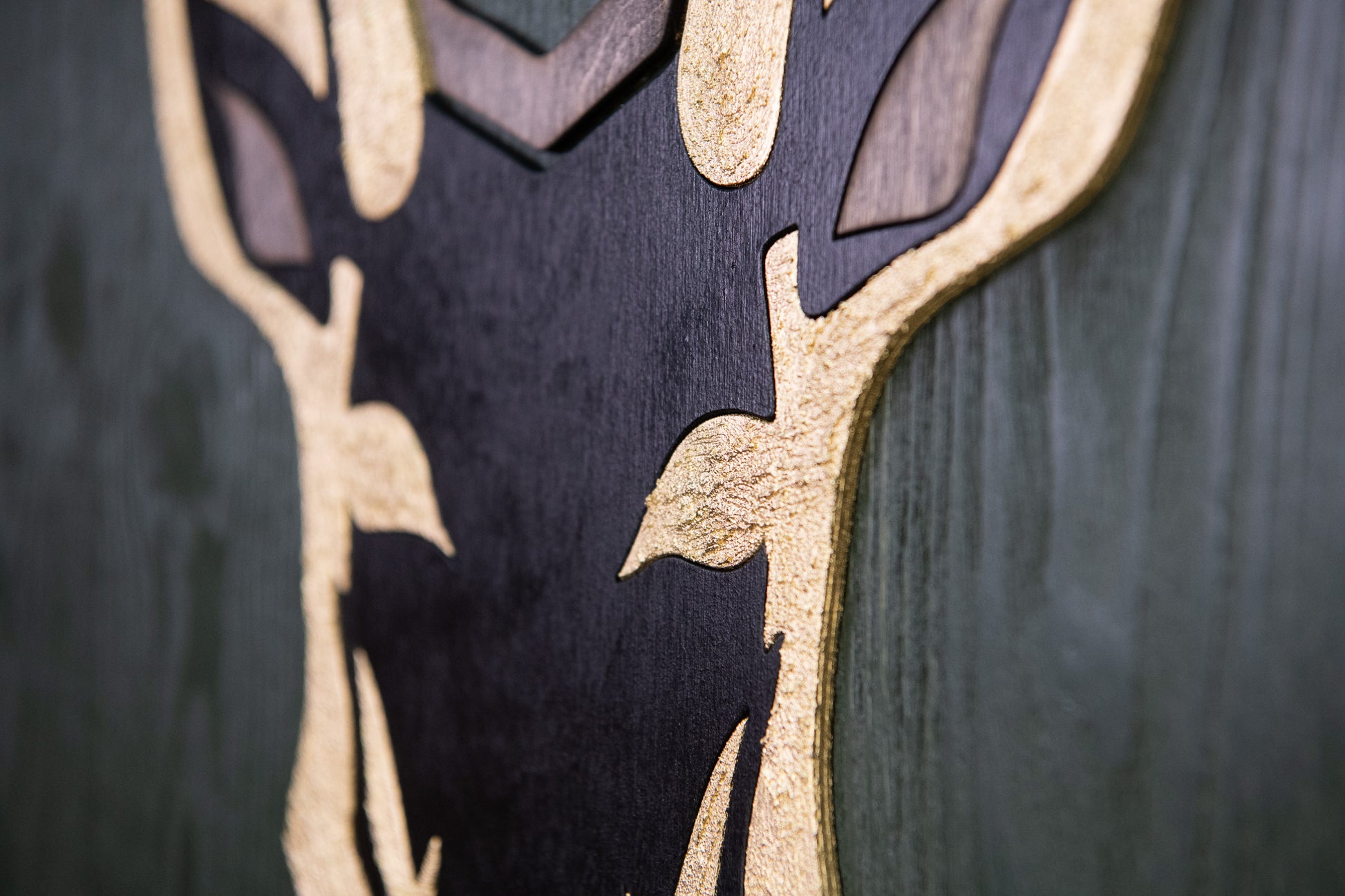 Φέρε τη γαλήνια δύναμη της φύσης στον χώρο σου με αυτόν τον χειροποίητο ξύλινο πίνακα τοίχου που απεικονίζει ένα επιβλητικό ελάφι με χρυσά κέρατα.