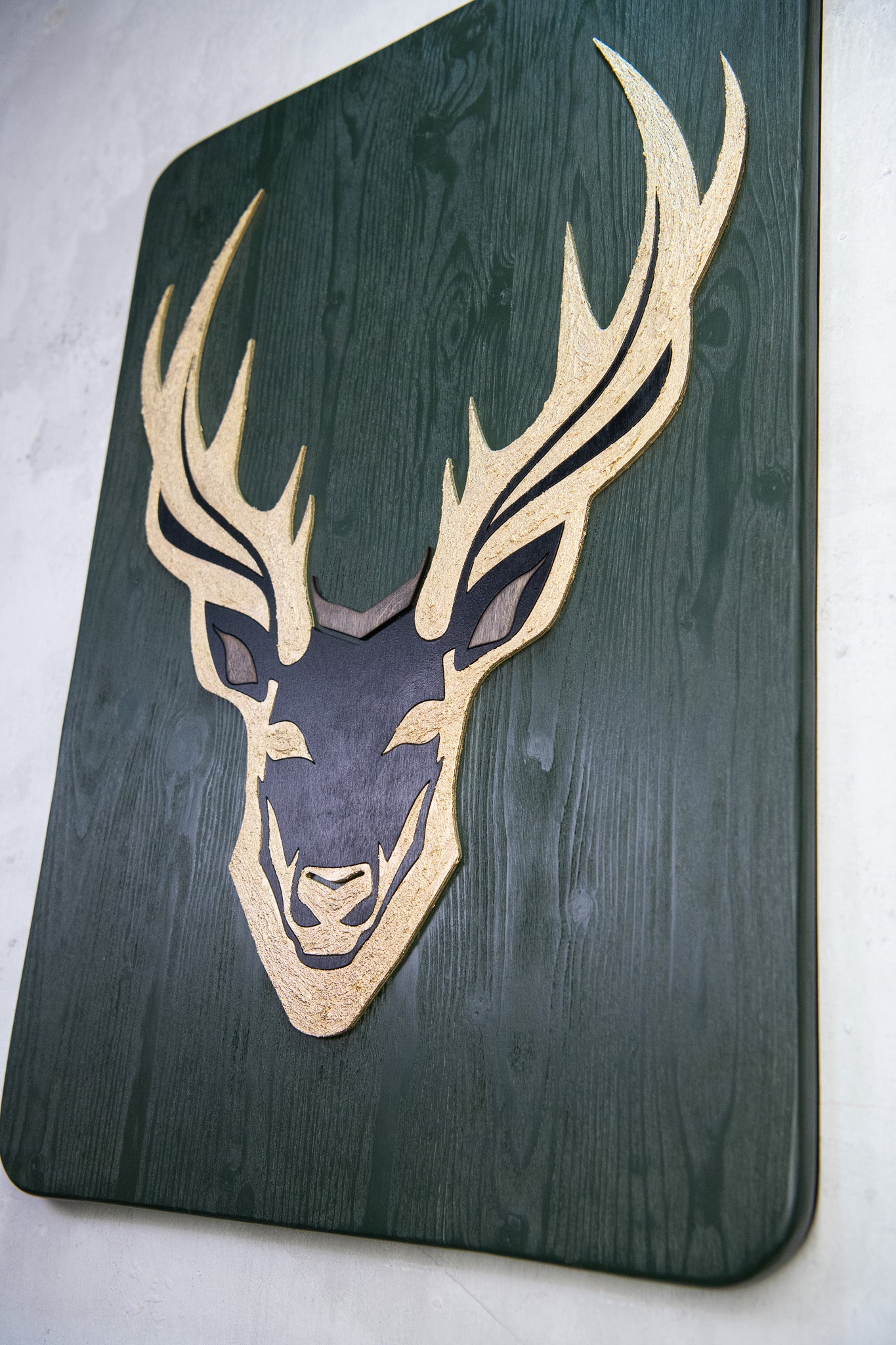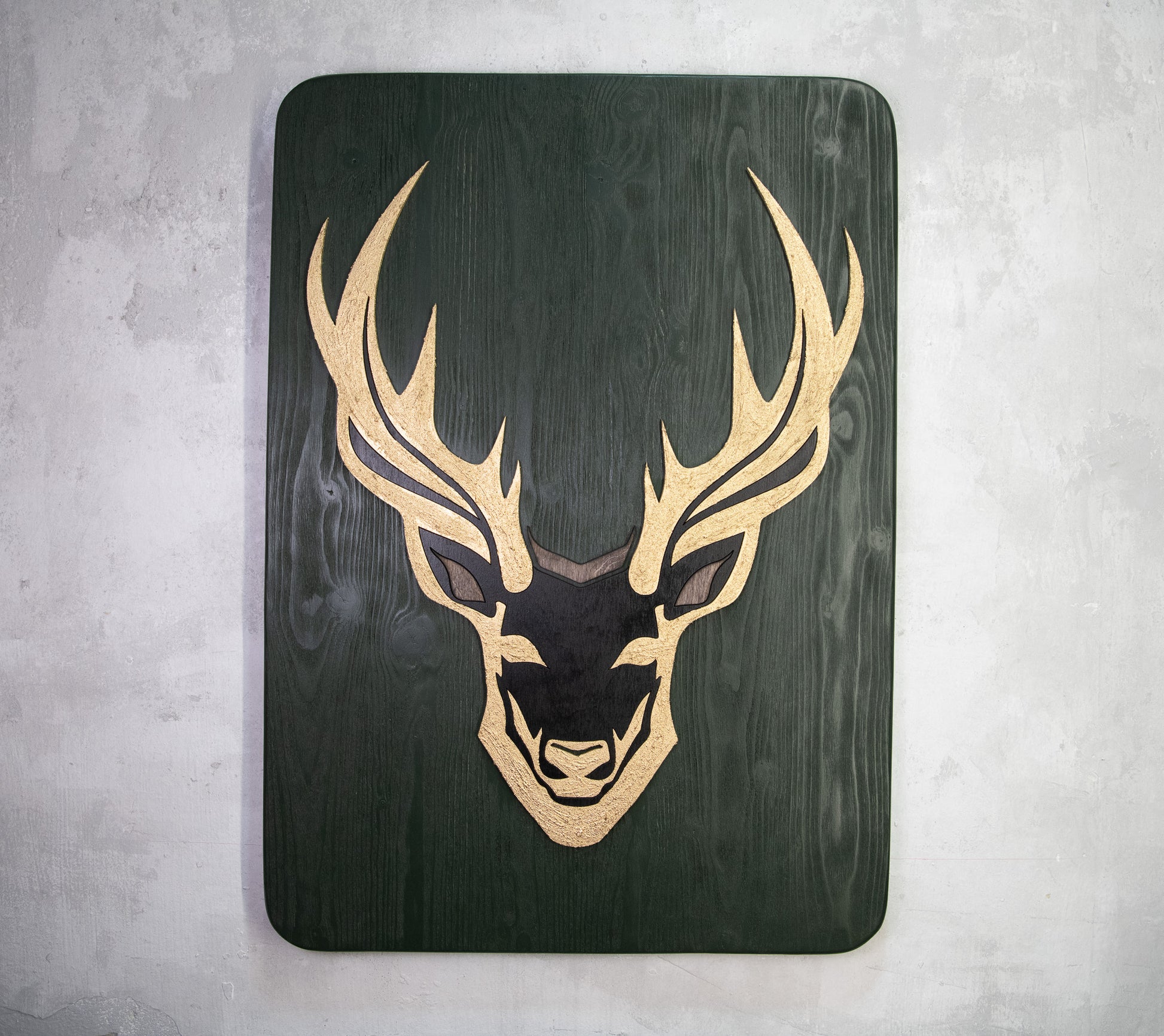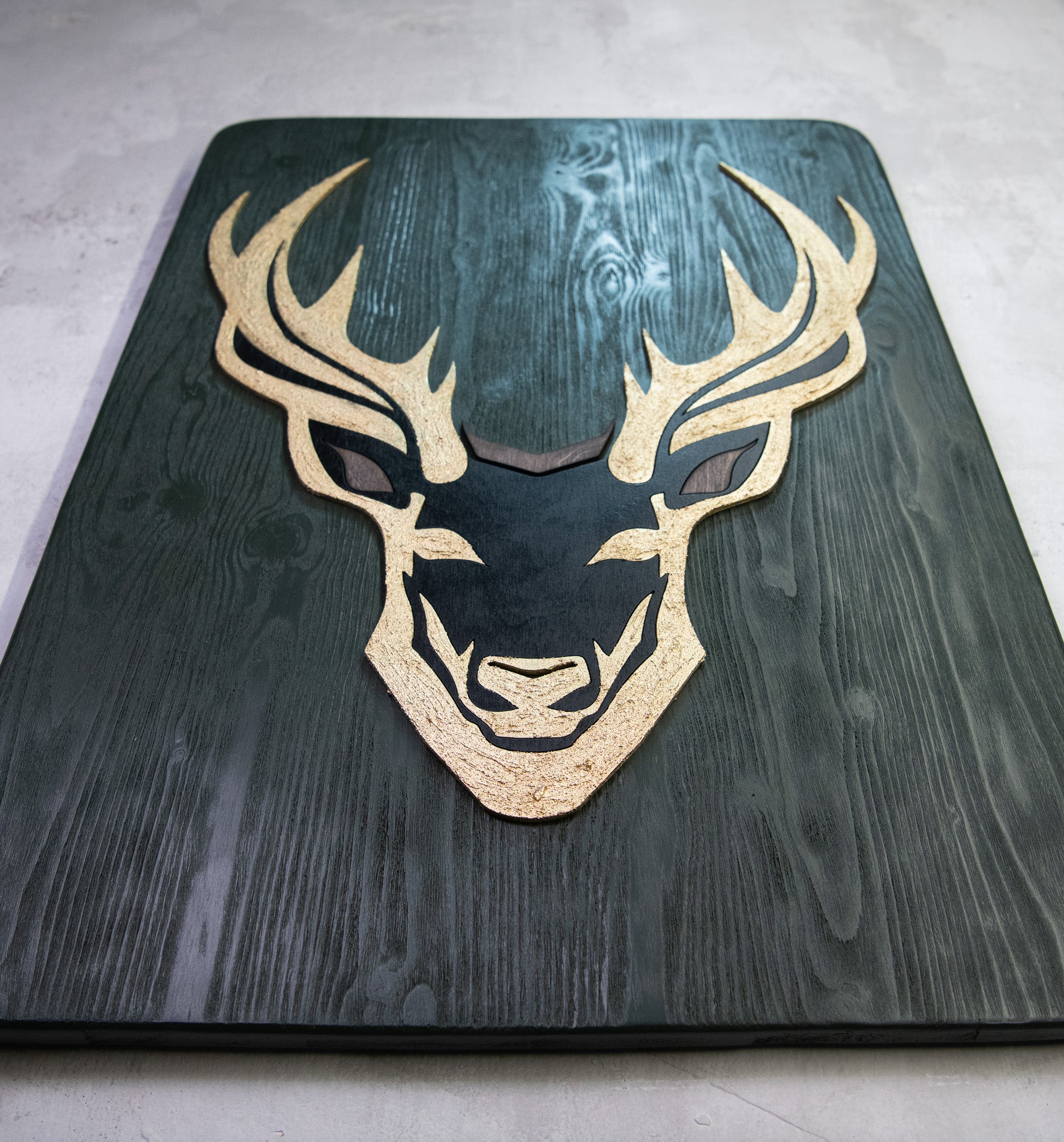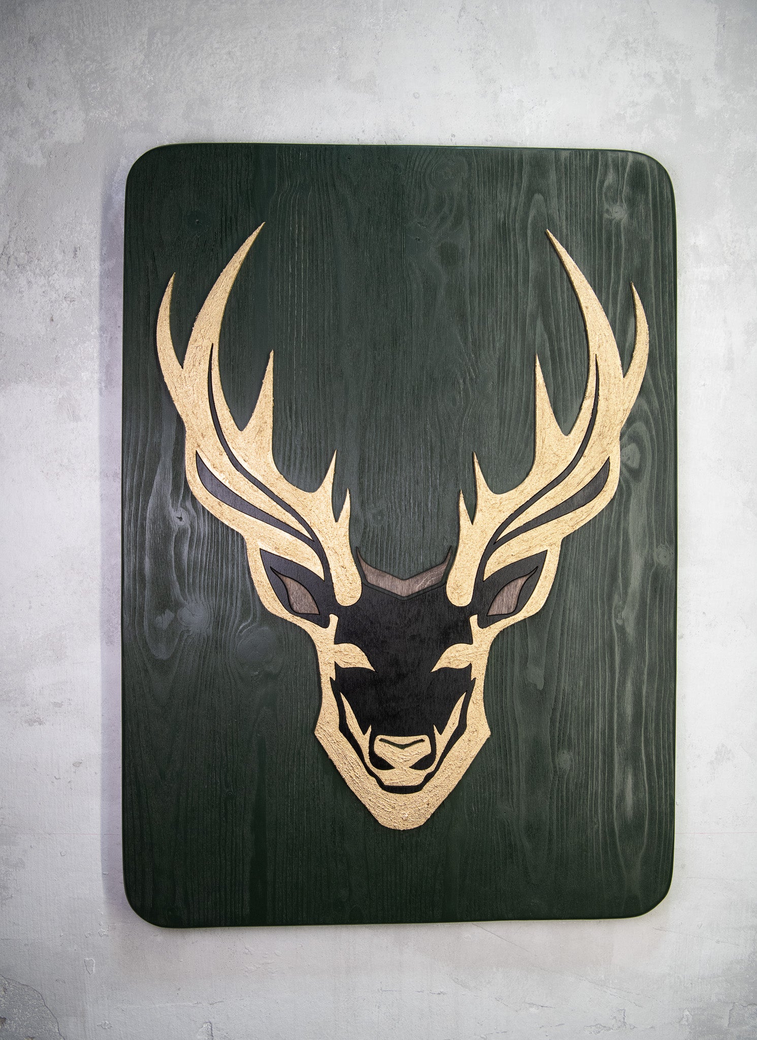 Φέρε τη γαλήνια δύναμη της φύσης στον χώρο σου με αυτόν τον χειροποίητο ξύλινο πίνακα τοίχου που απεικονίζει ένα επιβλητικό ελάφι με χρυσά κέρατα.