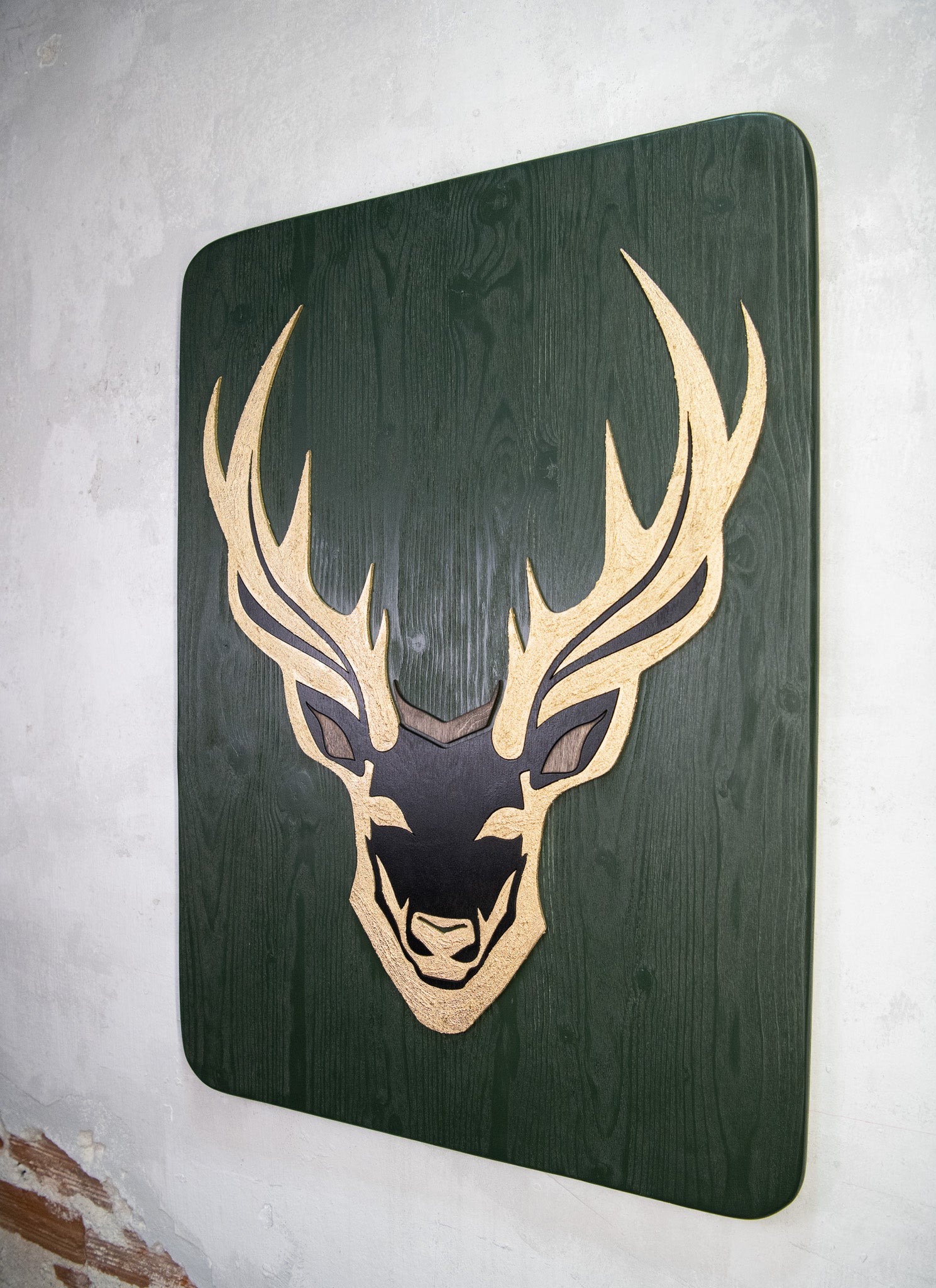 Χειροποίητος Ξύλινος Πίνακας με Ελάφι – Χρυσά Κέρατα & Πράσινο Φόντο | Μοντέρνα Rustic Διακόσμηση Τοίχου