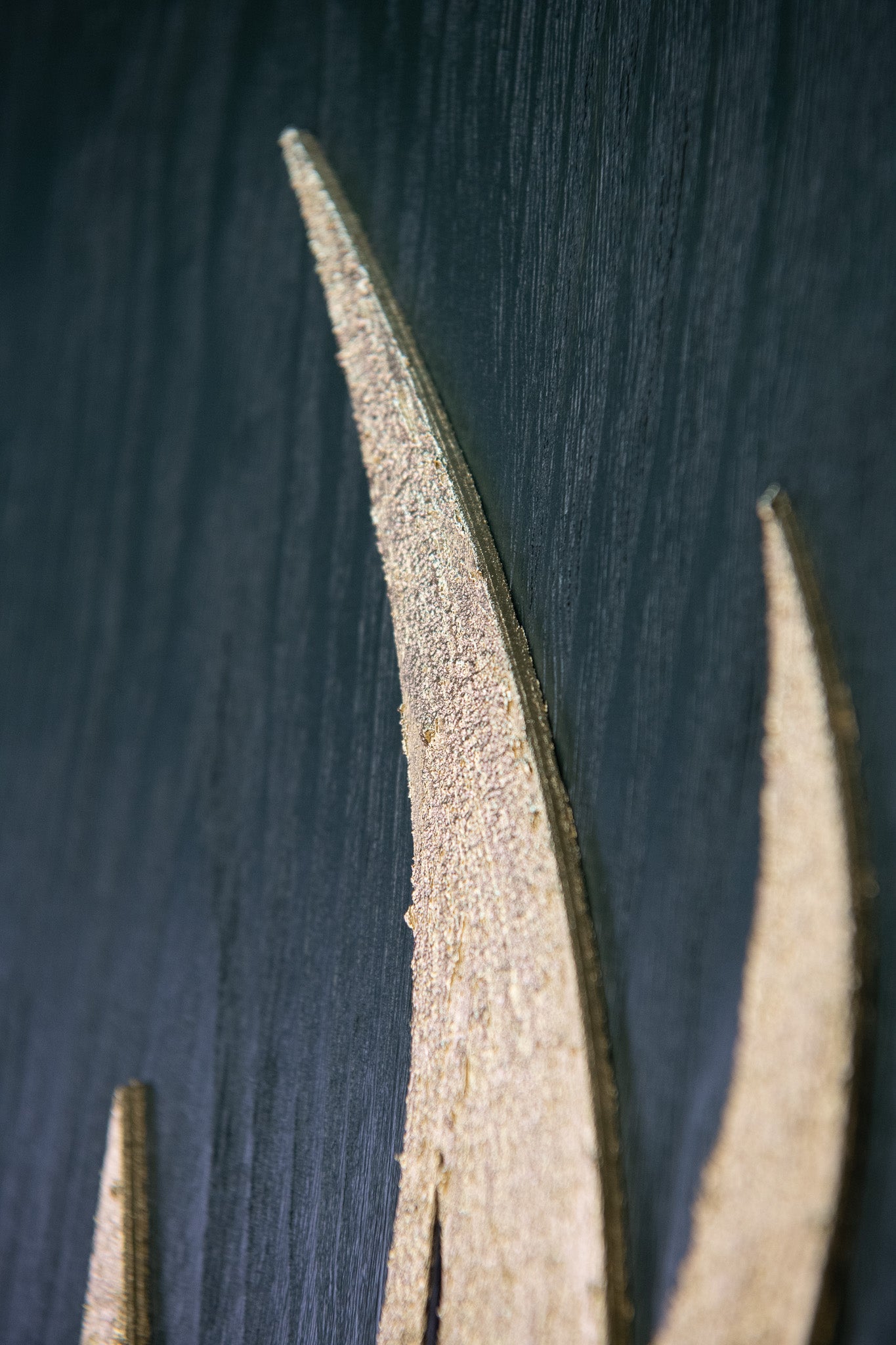 Το βαθύ πράσινο φόντο αναδεικνύει τα νερά του ξύλου, ενώ η χρυσή υφή δημιουργεί μοναδική λάμψη και κομψότητα.