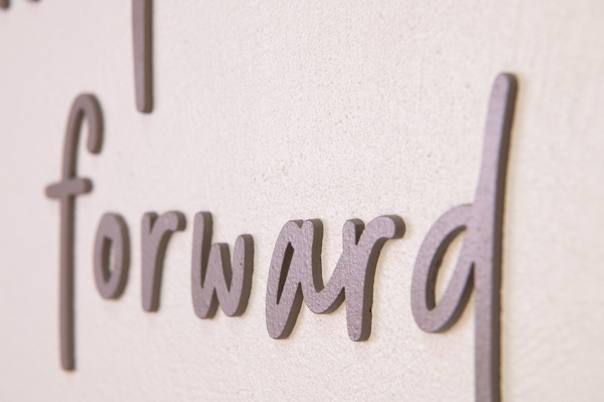 Υλικά: Κορνίζα από πεύκο, πλάτη MDF με εφέ τσιμέντου σε απαλό κρεμ, γράμματα από κόντρα πλακέ σε γήινο γκρι (taupe). Ο φωτεινός καμβάς σε συνδυασμό με το φυσικό ξύλο δημιουργεί αρμονία, ενώ τα γράμματα προσδίδουν βάθος και αυθεντικότητα.