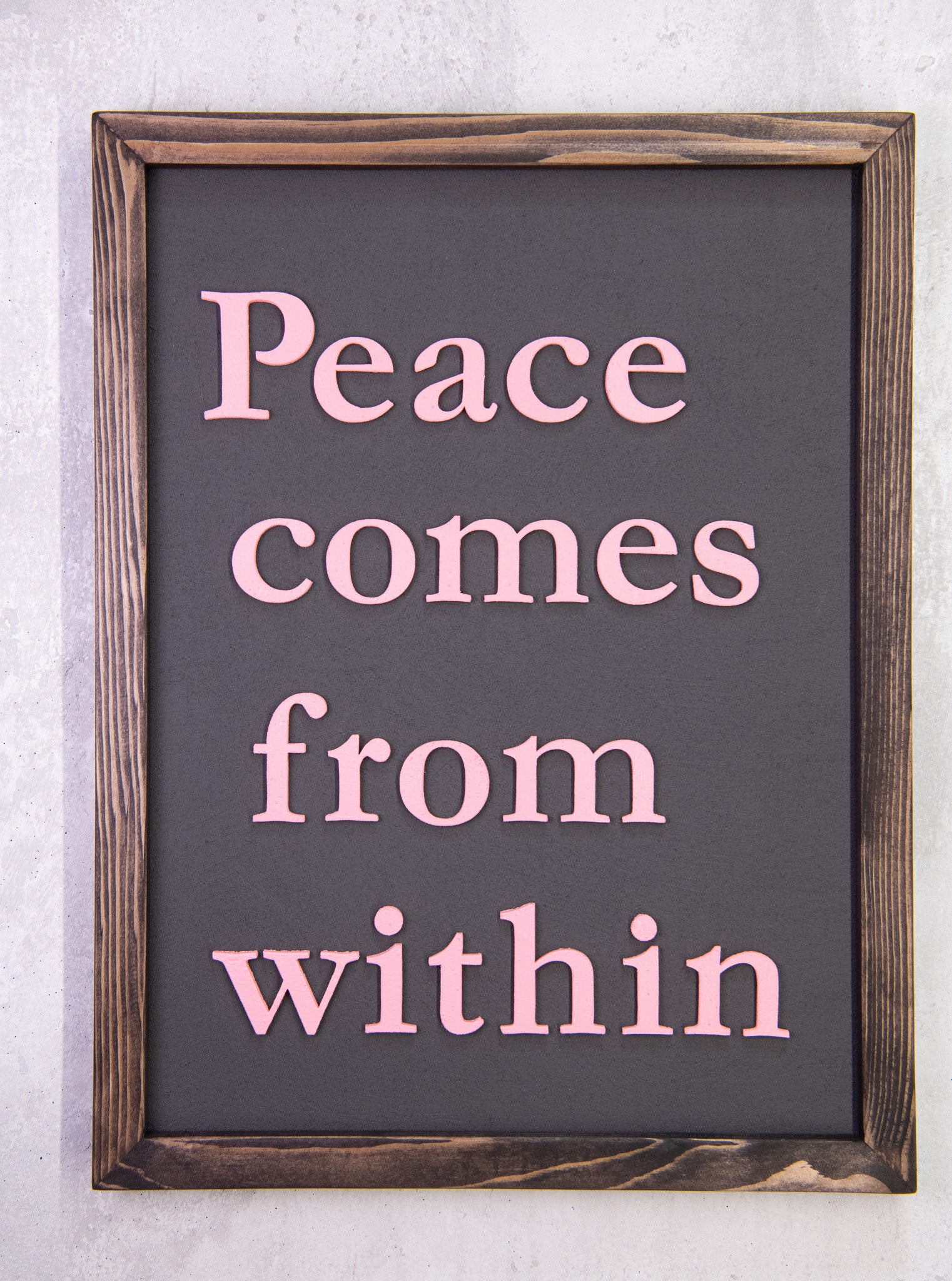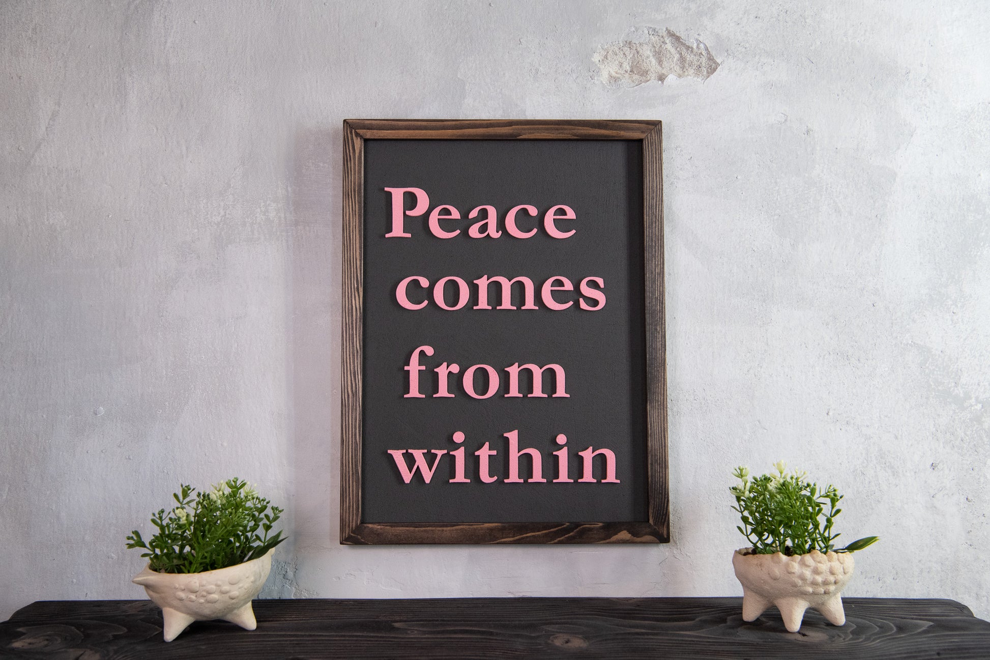 Ξύλινη Πινακίδα Τοίχου – Peace Comes from Within – Χειροποίητη με Εφέ Τσιμέντου