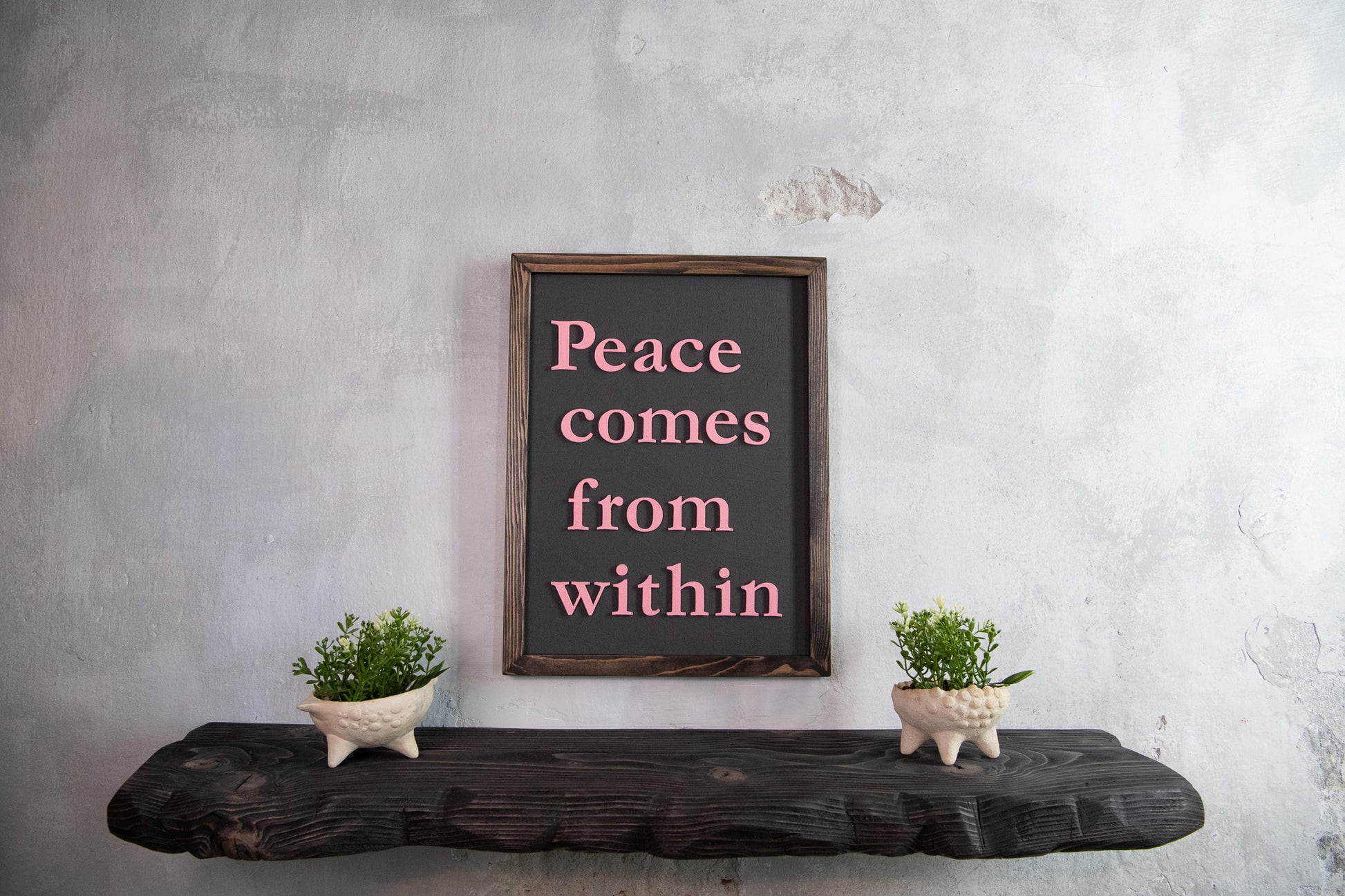 Η αληθινή ειρήνη δεν βρίσκεται στον θόρυβο του κόσμου, αλλά στη γαλήνη της καρδιάς. Το μήνυμα “Peace comes from within” είναι μια διαχρονική υπενθύμιση ότι η ηρεμία και η ισορροπία γεννιούνται μέσα μας. Αυτή η χειροποίητη ξύλινη πινακίδα τοίχου δημιουργήθηκε για να φέρει γαλήνη και mindfulness στον χώρο σου – ένας καθημερινός ψίθυρος να επιβραδύνεις, να αναπνεύσεις και να επανασυνδεθείς με τον εαυτό σου.