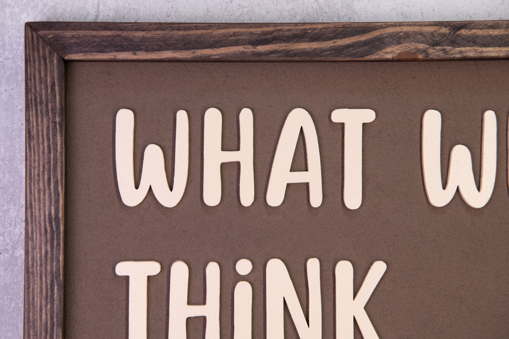 Ξύλινη Πινακίδα Τοίχου – What We Think, We Become – Χειροποίητη με Εφέ Τσιμέντου