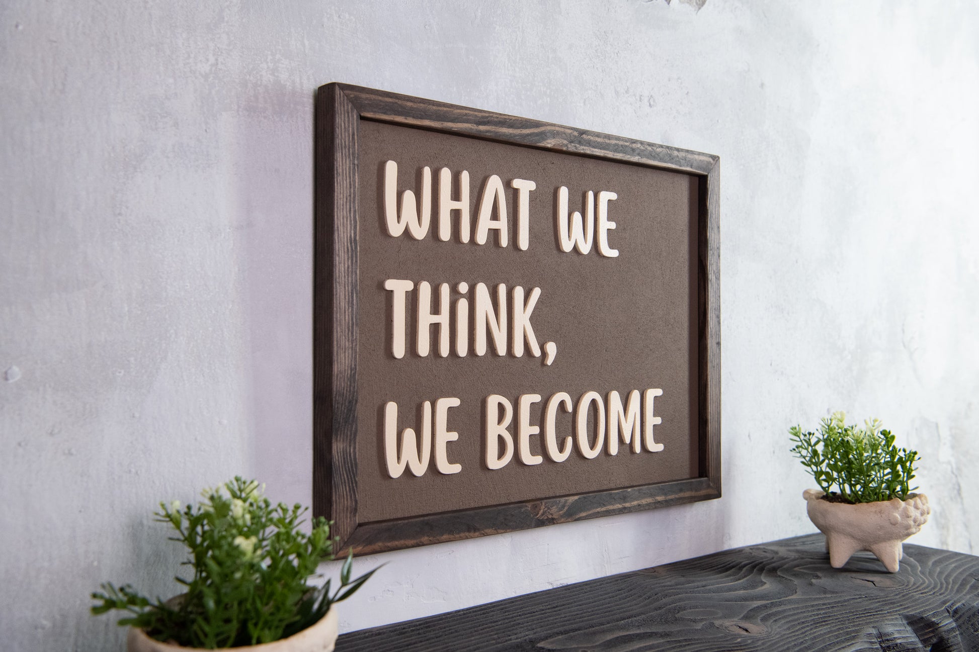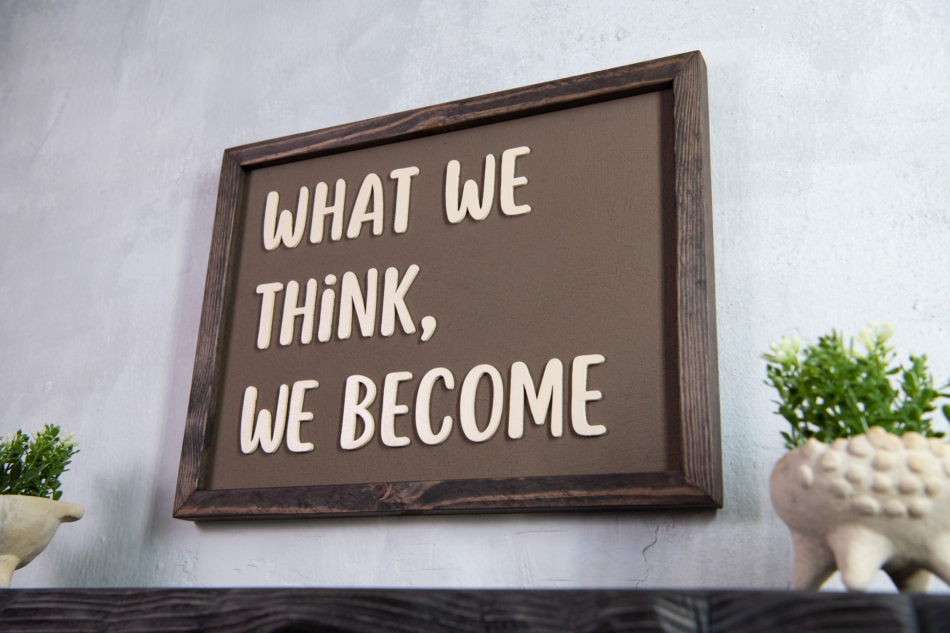 Οι σκέψεις μας διαμορφώνουν την πραγματικότητά μας. Το μήνυμα “What we think, we become” είναι μια διαχρονική υπενθύμιση ότι κάθε ιδέα που κρατάμε μέσα μας έχει τη δύναμη να μας μεταμορφώσει. Αυτή η χειροποίητη ξύλινη πινακίδα τοίχου αποτυπώνει αυτή τη σοφία και τη μετατρέπει σε καθημερινή έμπνευση – μια δημιουργία που ενθαρρύνει mindfulness, θετικότητα και εσωτερική δύναμη.